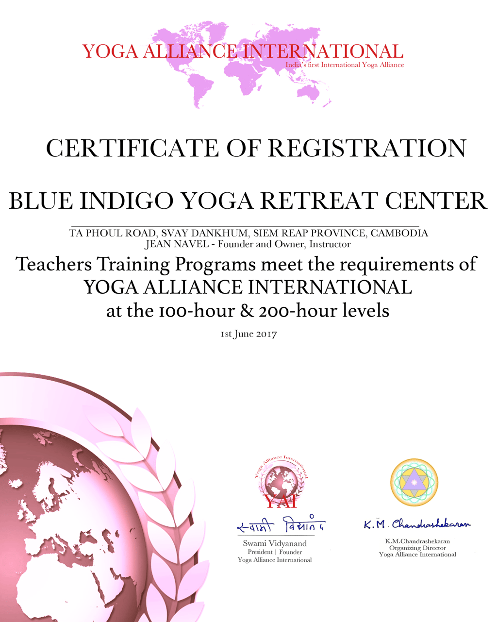 Official certificate of continued education with Yoga Alliance International
